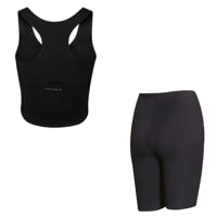Set je vyrobený z mäkkého, pružného a na dotyk mimoriadne príjemného materiálu. Ponúka funkčné vlastnosti technického oblečenia, laserom rezané okraje a lepené lemy eliminujú švy, takže všetko perfektne sedí, nikde netlačí a zaručuje úplnú voľnosť pohybu. Tielko vďaka laserovej perforácii na hrudníku zaisťuje výborné odvetrávanie aj pri intenzívnom pohybe. Šortky zaujmú na prvý pohľad svojim dizajnom aj prepracovaným strihom. Zdvojený laserom rezaný pás s embosovaným vzorom je nielen štýlový, ale aj funkčný – tvaruje oblasť bruška, drží na mieste a zaisťuje pohodlie po celý tréning.